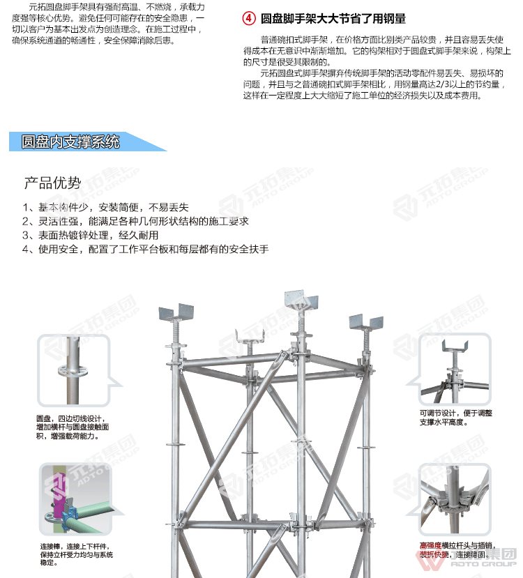 橋梁專用承插型盤扣式腳手架,圓盤式腳手架具有基本構(gòu)件少、架設(shè)及拆卸作業(yè)方便、施工工效高、承載力強(qiáng)等特點(diǎn),被廣泛應(yīng)用于橋梁、隧道、電力、石化、造船、鐵路、機(jī)場、碼頭等工業(yè)及民用建筑的工程領(lǐng)域。相對于鋼管扣件式腳手架和碗扣式腳手架,圓盤腳手架有不可替代的優(yōu)勢。