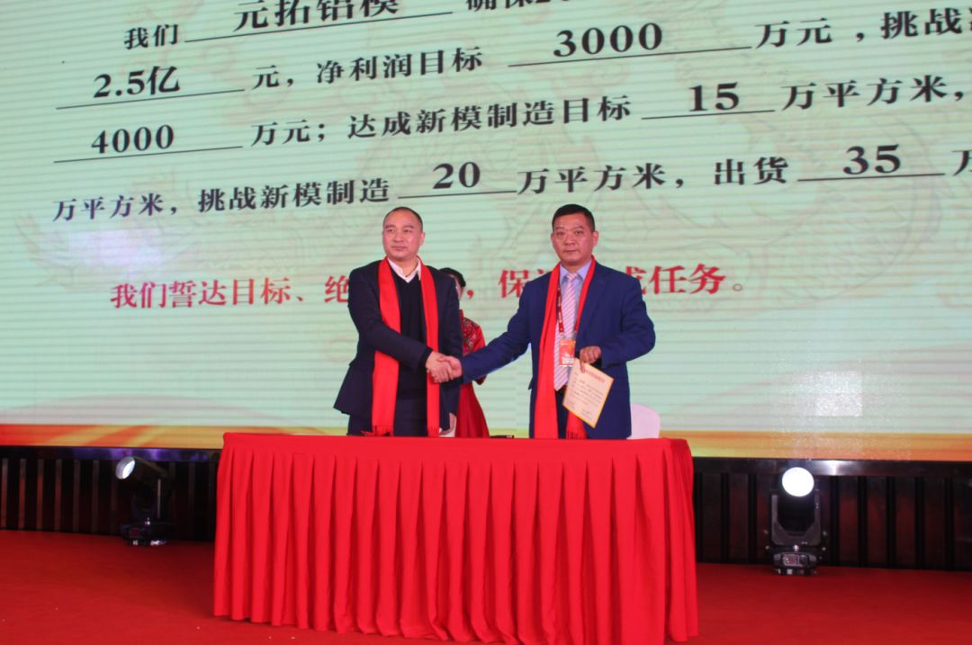 現(xiàn)場,元拓建材集團董事長游炎明與三大業(yè)務(wù)板塊領(lǐng)頭人簽訂了2019年度經(jīng)營目標(biāo)挑戰(zhàn)承諾書,三位領(lǐng)頭人再把任務(wù)進(jìn)行詳細(xì)分解并與下屬團隊負(fù)責(zé)人簽署了目標(biāo)責(zé)任書。全體業(yè)務(wù)、生產(chǎn)骨干紛紛在臺上宣誓,2019年將全力以赴,堅決完成挑戰(zhàn)目標(biāo)。